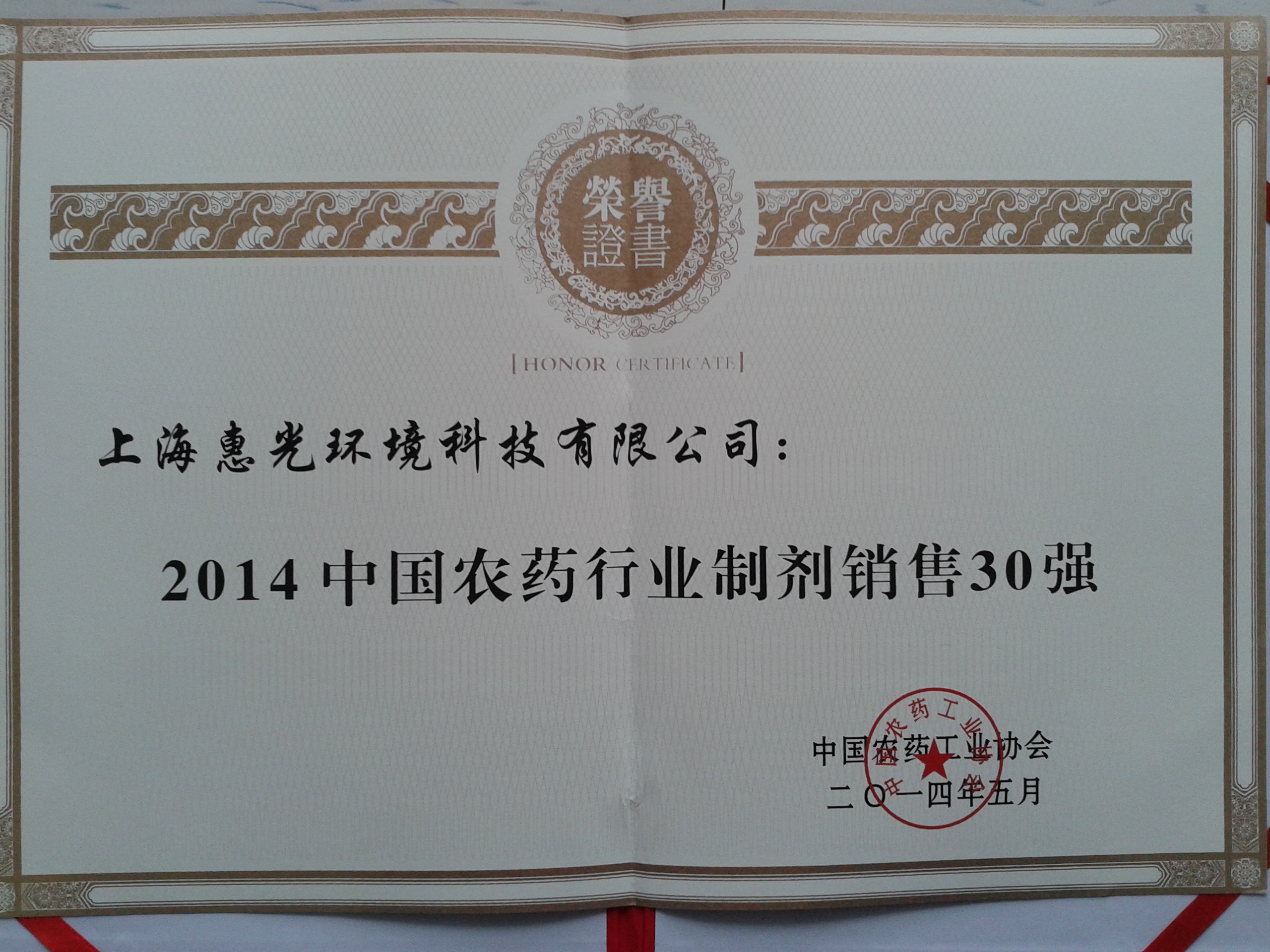 上海惠光名列2014年中國農葯行業制劑銷售30強企業